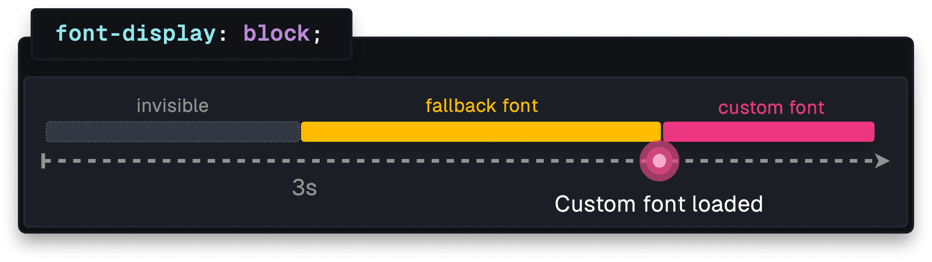 . It briefly renders invisible text, and defaults to the fallback font. If the web font still hasn’t loaded after 3 seconds, the fallback font remains even if the custom font loads later. Future navigations will display the custom font.