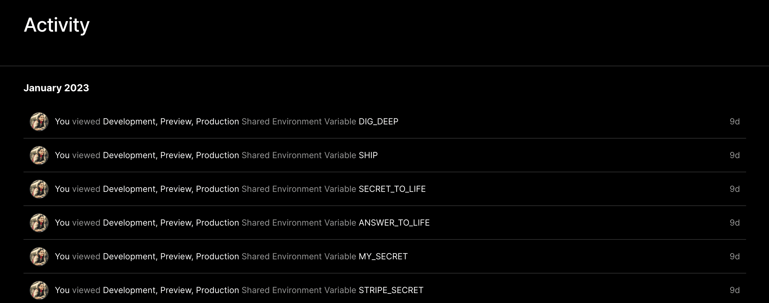 Activity Logs provide chronologically organized events on your personal or team account. You get an overview of changes to your environment variables, deployments, and more.