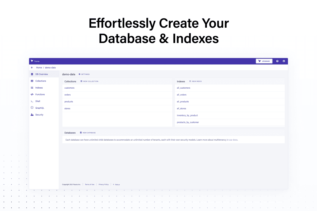 Each of your projects will get its own Fauna database. You can either create a new database or use an existing database from your Fauna account.