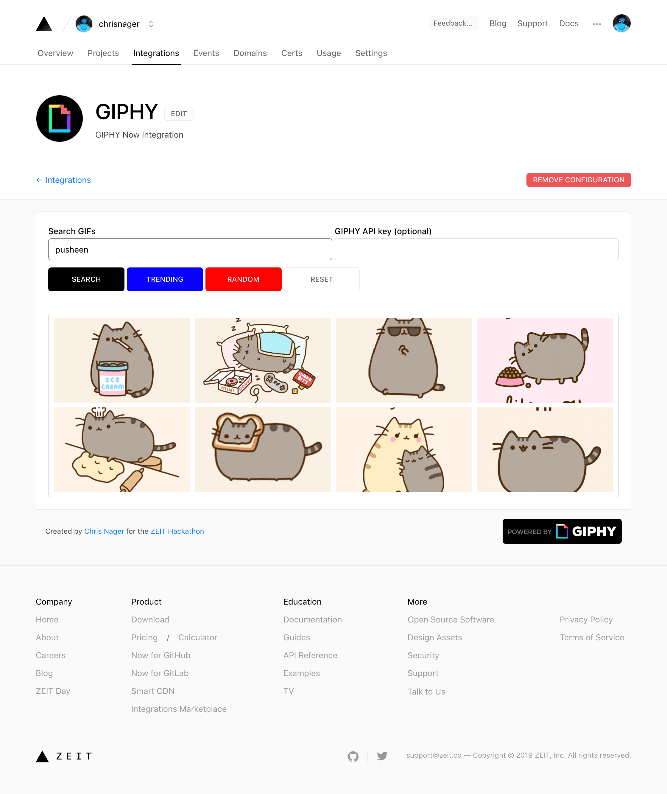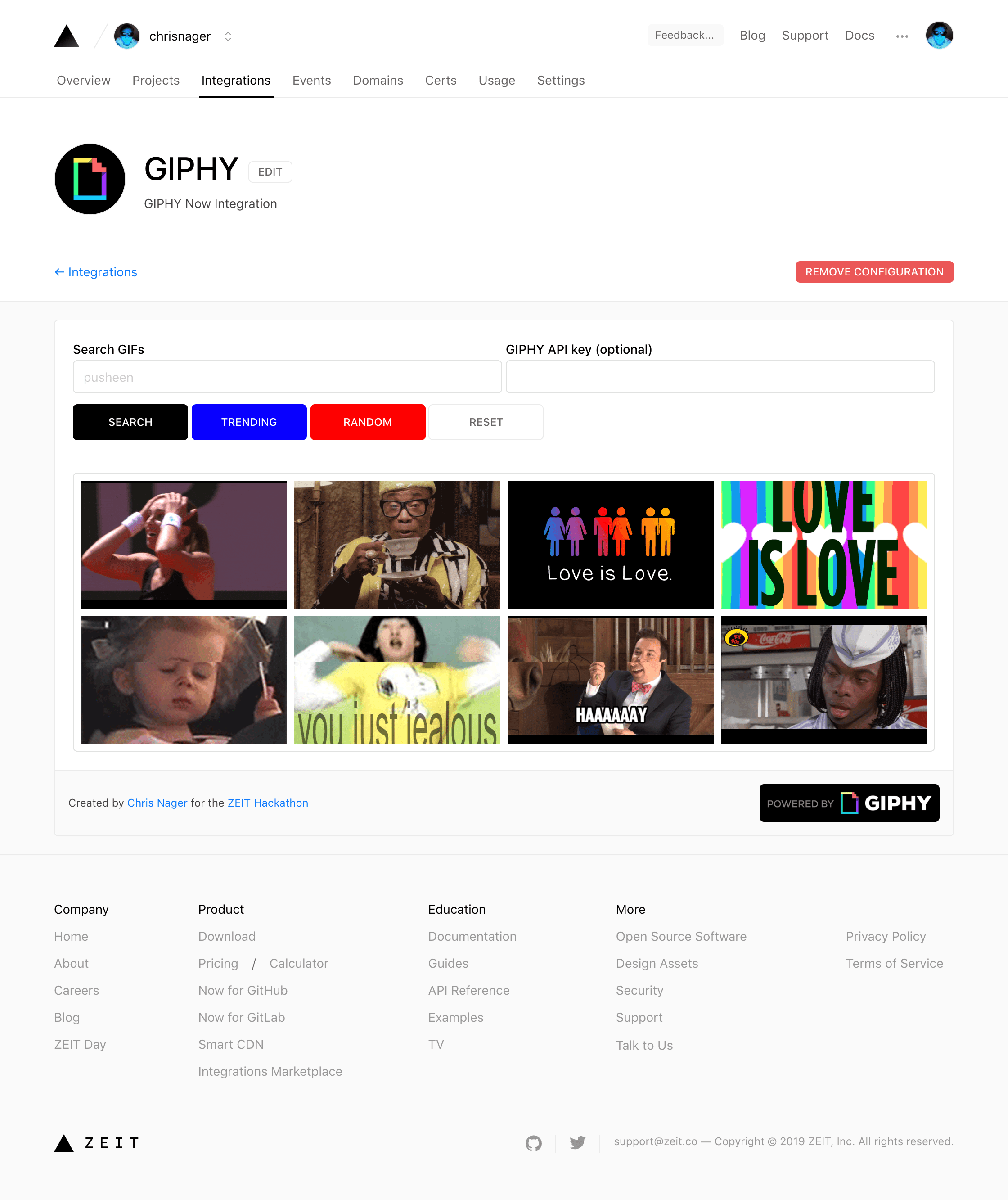 The GIPHY Now Integration allows users to discover GIFs from their Now Dashboard by searching, seeing which GIFs are trending, randomly selecting one, or searching by query. Users have the option to supply their own GIPHY API keys or use the existing one that powers this integration.
