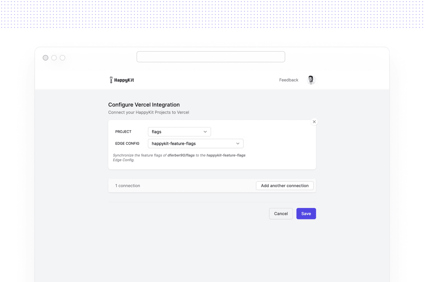 This integration allows you to read your HappyKit feature flags at incredibly low latency from your Vercel-hosted projects. Every time you update your feature flags on HappyKit this integration will write the latest flag definitions into an Edge Config. You can then read the latest feature flags from your Vercel-hosted projects with incredibly low latency.