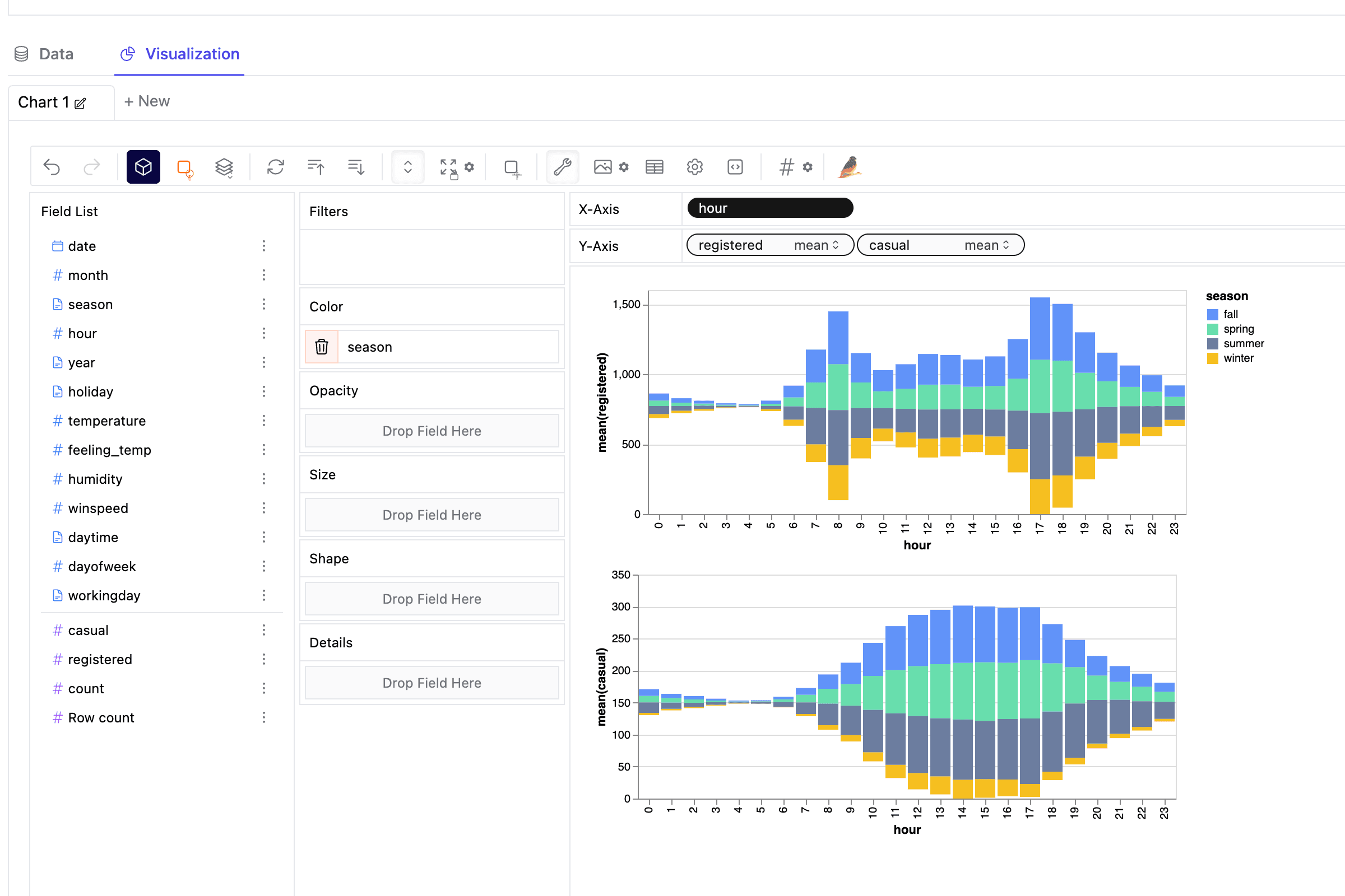Kanaries log walker is not a static dashboard like other analytics tools, it allows you to analysis data without a pre-defined data models or schemas with drag and drop operations. You can make any kind of analysis as you want.
