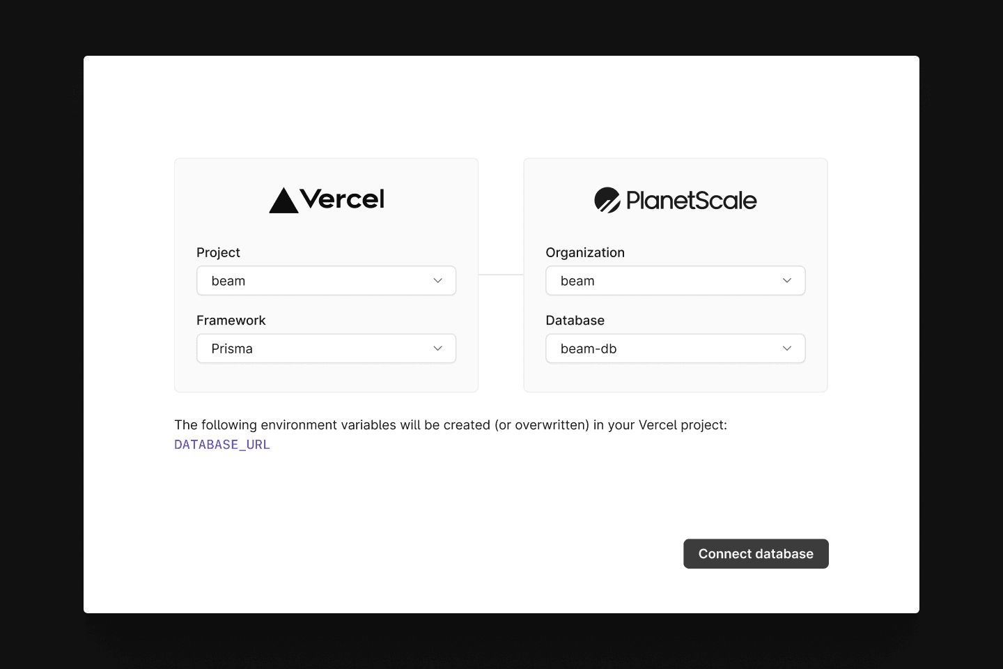The integration connects to your existing PlanetScale database and sets the necessary environment variables in your Vercel project. These environment variables will differ depending on the language or framework you're using. We include a dropdown in the integration setup that lets you select the framework you're using, and then we'll automatically create the applicable environment variables for you. To get started, you just need a PlanetScale database and a Vercel project.
