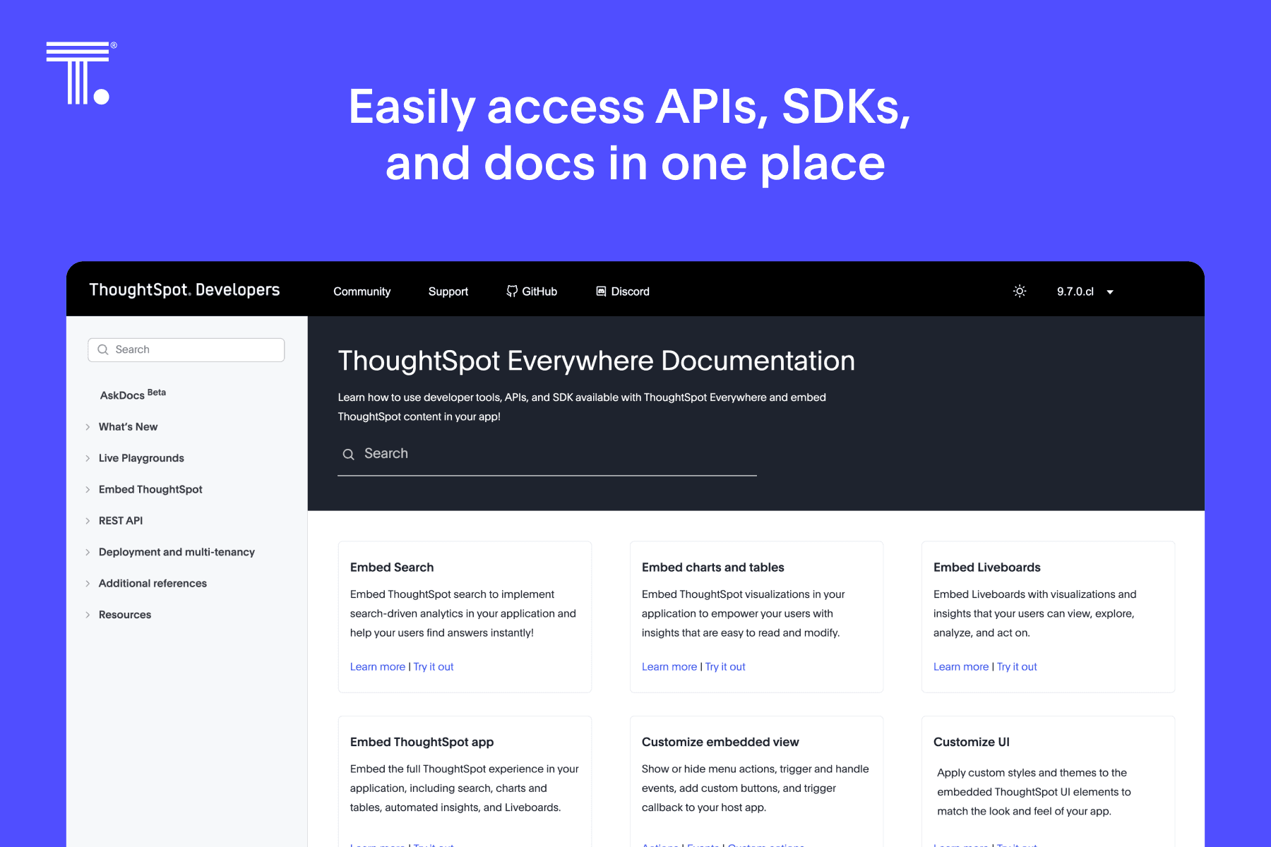 Access documentation, APIs, and SDKs in one place with the Developer Playground. Need help? Ask our AI-powered AskDocs assistant or chat with our team on our ThoughtSpot Embedded Discord channel.