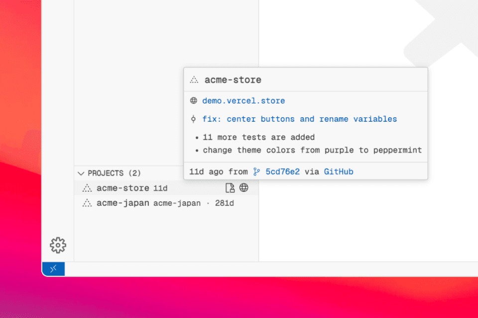 VSCode Vercel is a free, open-source extension for Visual Studio Code and it’s forks. Install here.