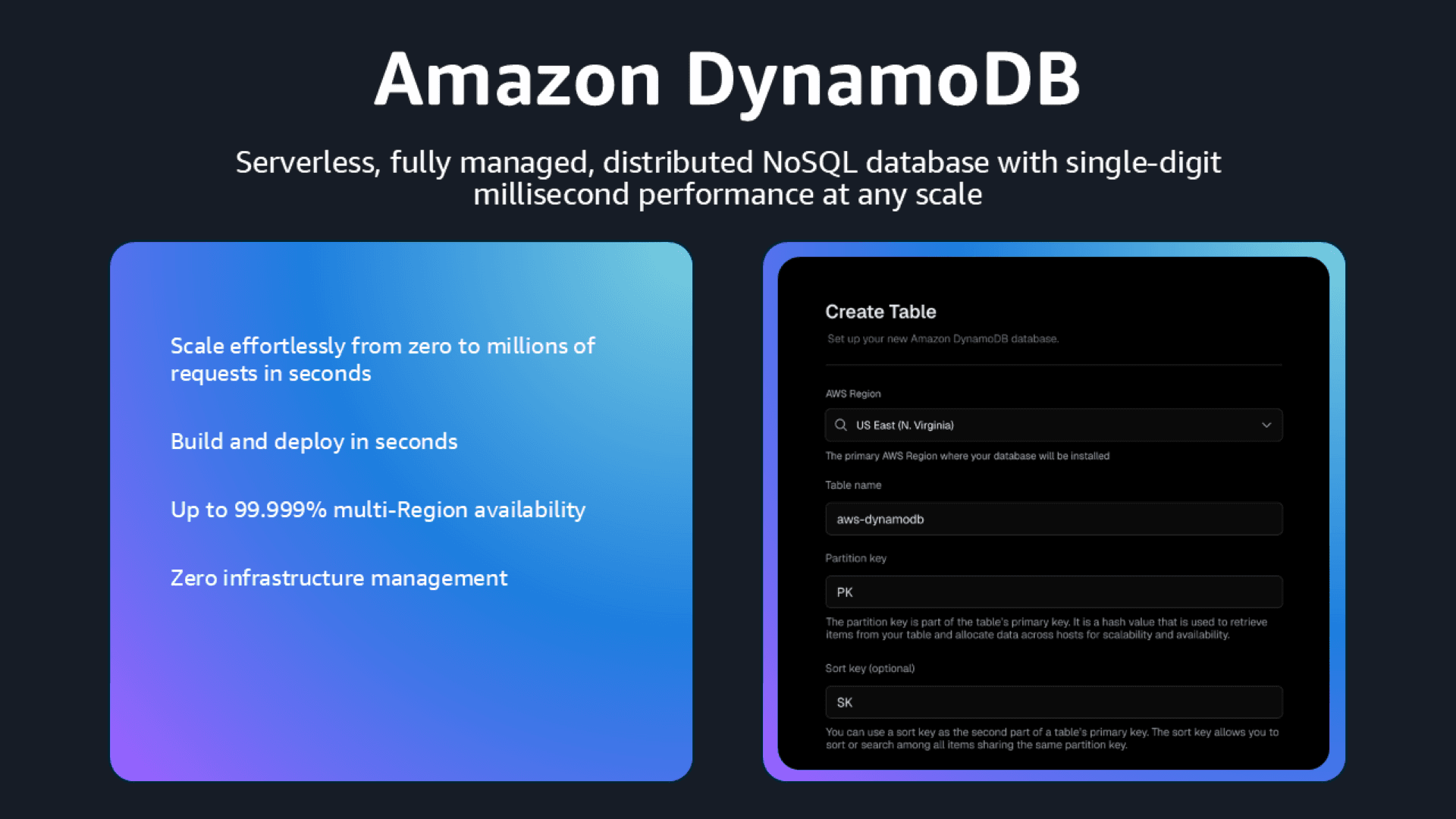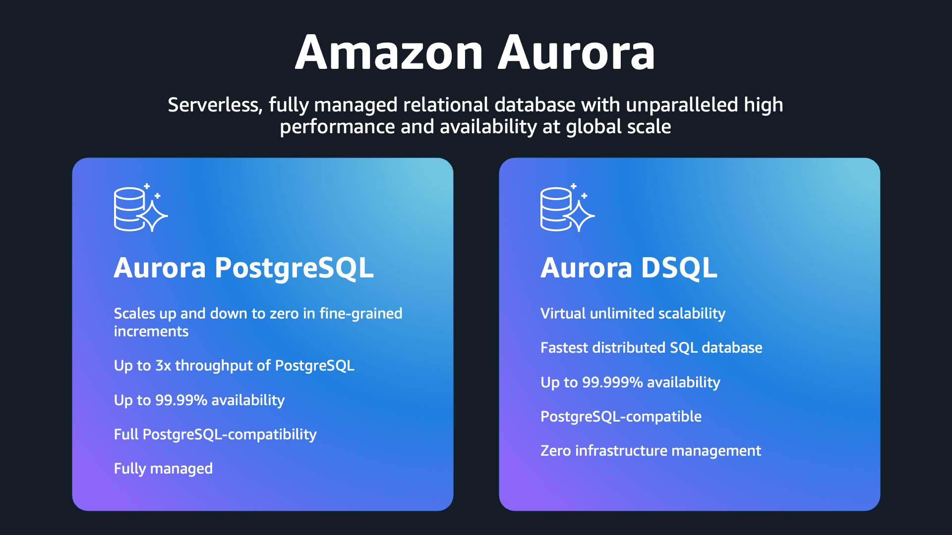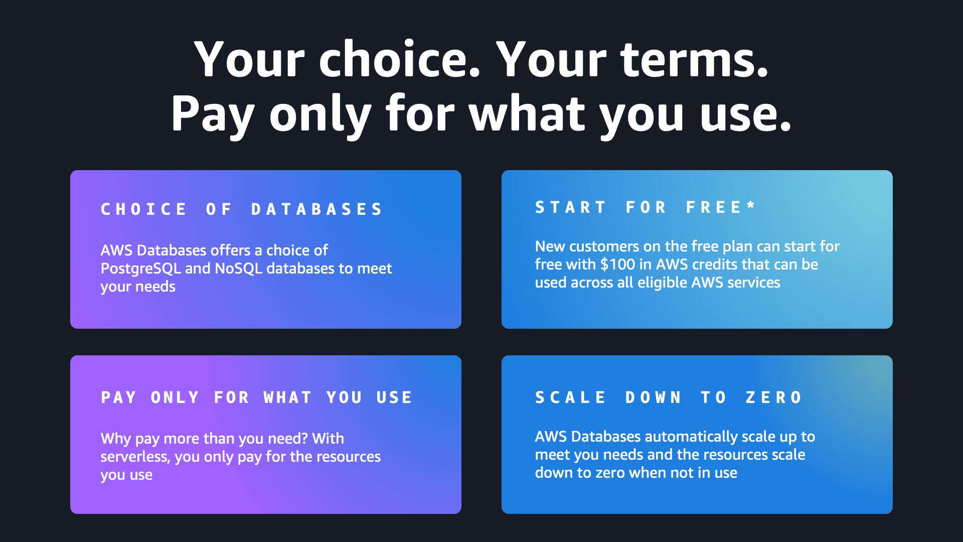 Coming SoonBuild at the speed of an idea with AWS Databases. Create a new database in seconds and add features on-demand as your application grows. Focus on coding, not infrastructure management—our serverless, fully managed PostgreSQL and NoSQL databases automatically scale with your workload while you only pay for what you use. Whether you're prototyping your next big idea or powering production AI and data-driven applications, AWS Databases deliver the security, reliability, and price performance you need without the operational overhead.