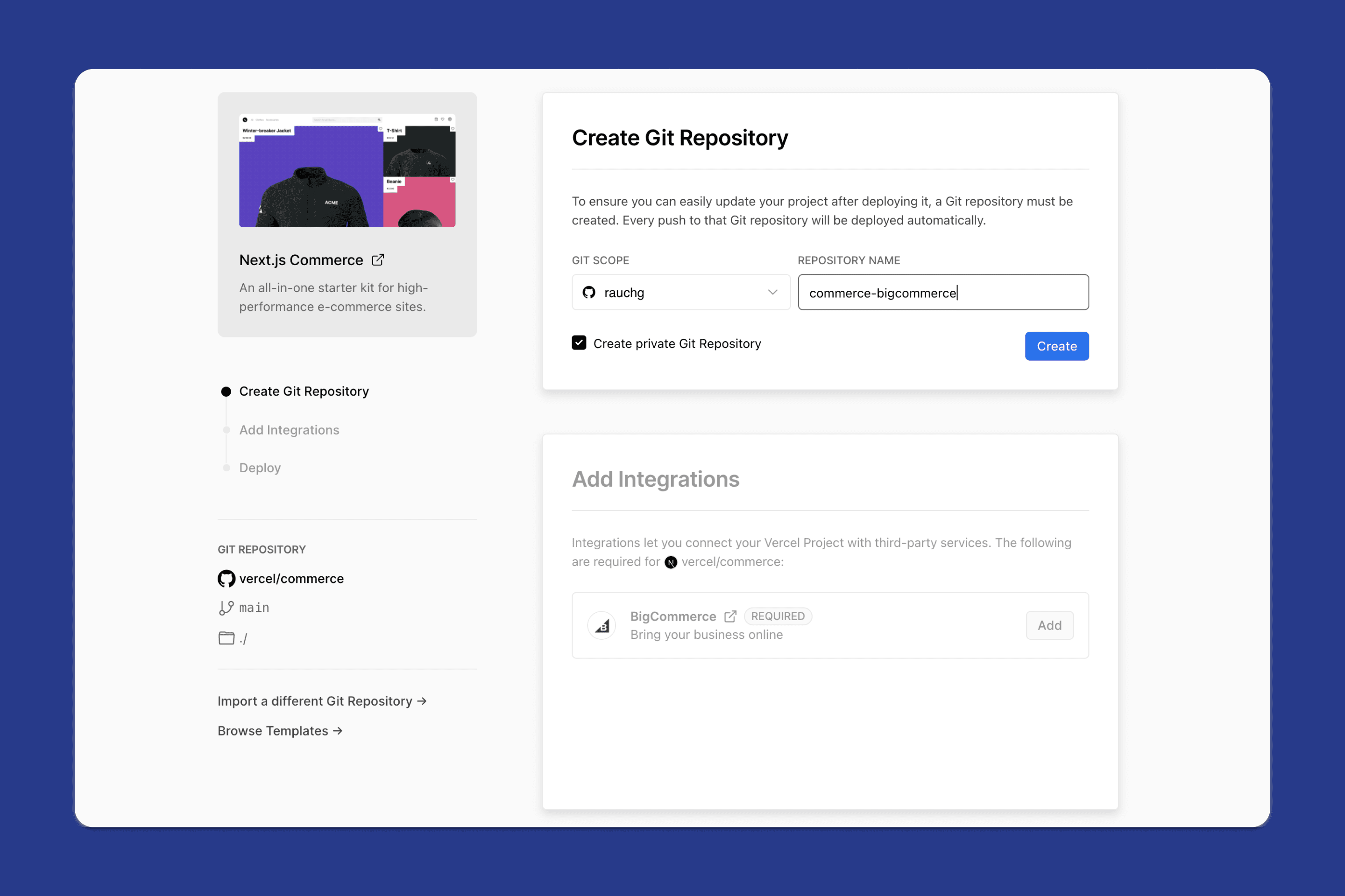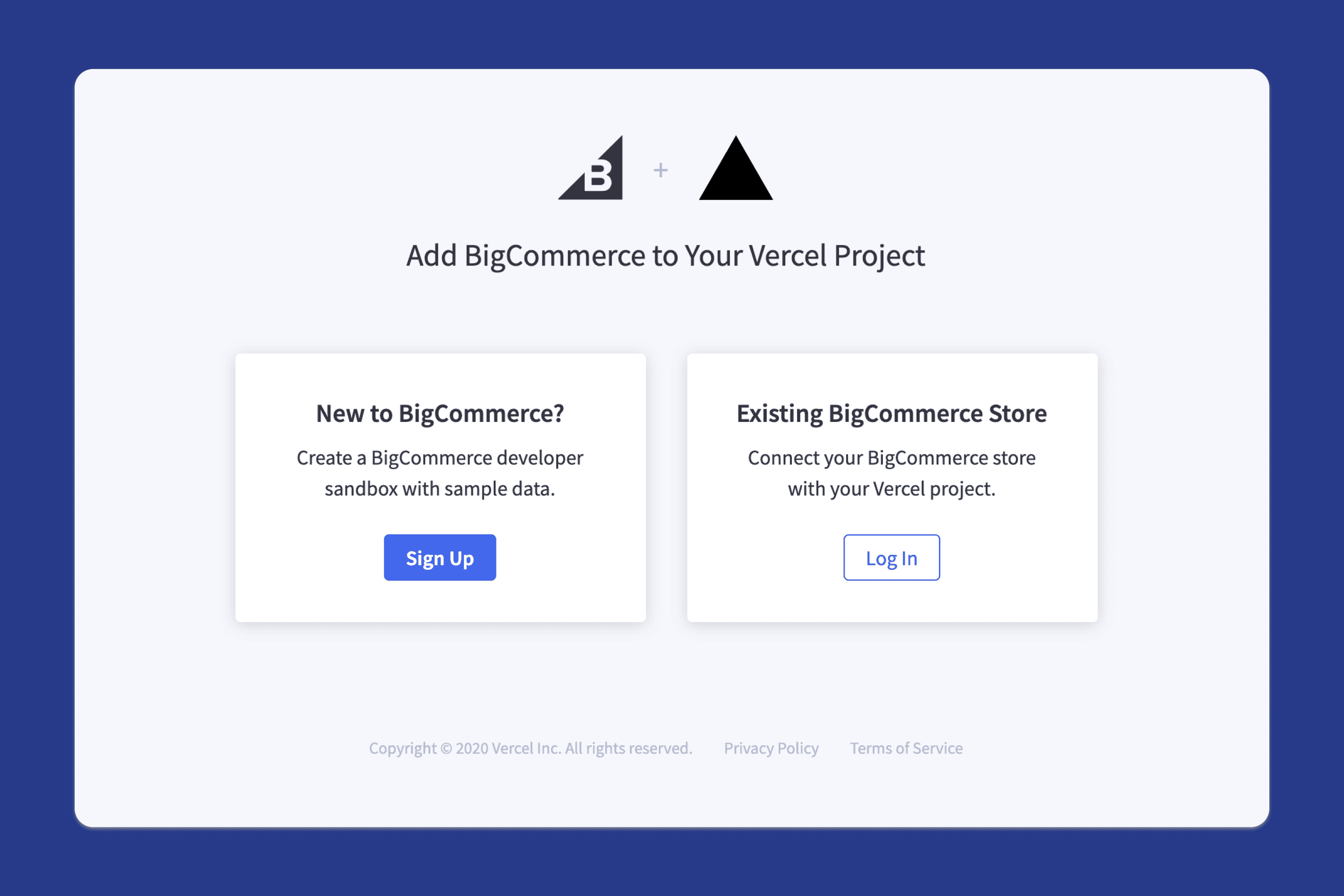 This integration will connect your Vercel Project to a new or existing BigCommerce store.