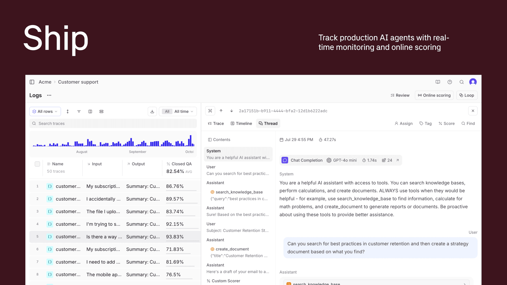 Choose from Free and Pro plans with instant setup. Query, filter, and analyze logs 80x faster with Brainstore, our database purpose-built for AI workloads. Braintrust integrates seamlessly with the Vercel AI SDK for automatic tracing and observability.