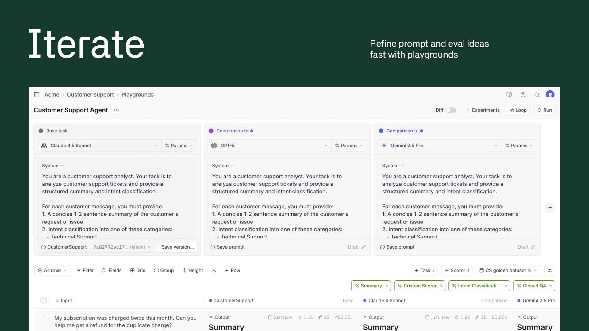 Braintrust provides the infrastructure to build reliable AI applications with systematic evals, real-time monitoring, and production-grade performance. Monitor your AI applications with comprehensive logging and tracing, run evals to catch issues before they reach users, and benchmark across models from OpenAI, Anthropic, Gemini, and more—all from your Vercel dashboard.