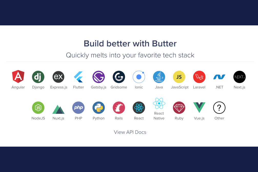 Butter's clean JSON API is easy to integrate with apps built in your favorite frameworks: Next.js, Angular, React, and more.