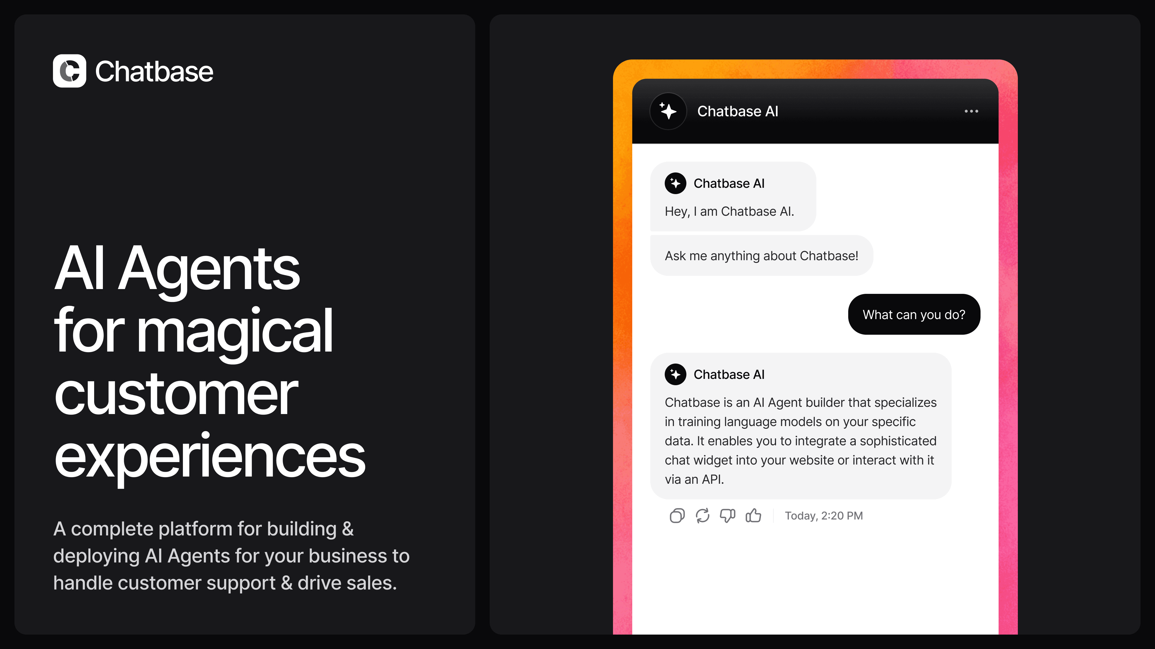Chatbase is a complete no-code platform for building, deploying, and optimizing AI support agents over your own data. Trusted by over 9,000 businesses across 140+ countries, Chatbase empowers teams to deliver actionable customer experiences — swiftly, securely, and intelligently.