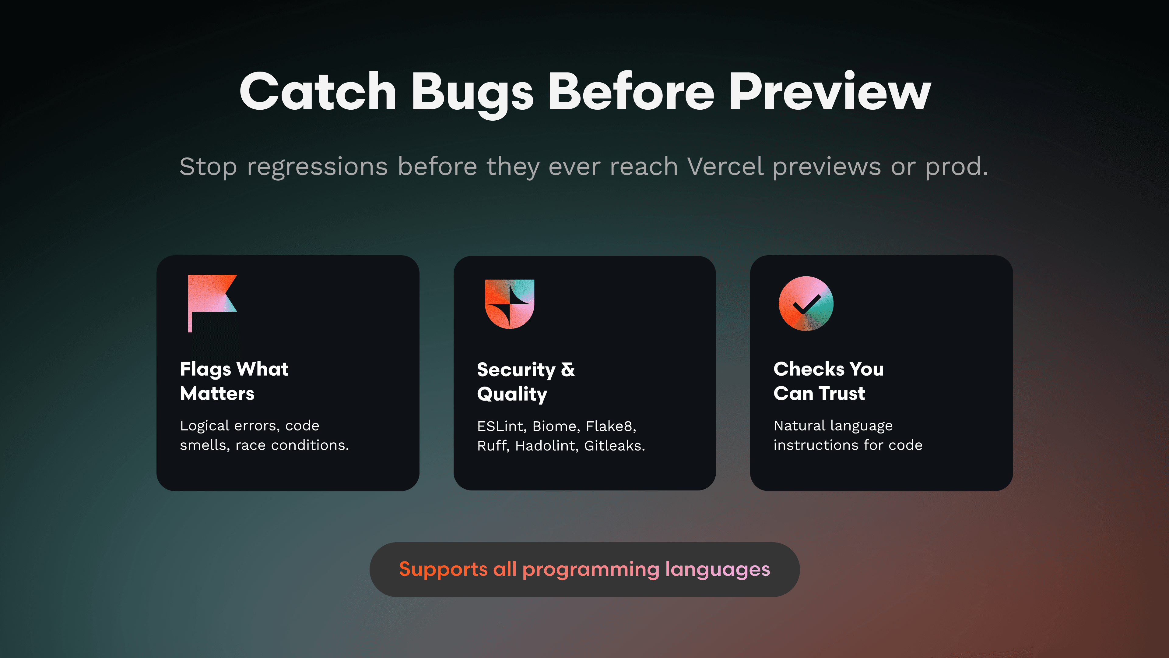 Works natively with Vercel projects. Context‑aware, customizable, and improving with every interaction. Catch bugs, harden security, and ship faster with one‑click fixes on every PR. Trusted by Open source projects like Bun, NuxtJS. Cut code review time and bugs in half.