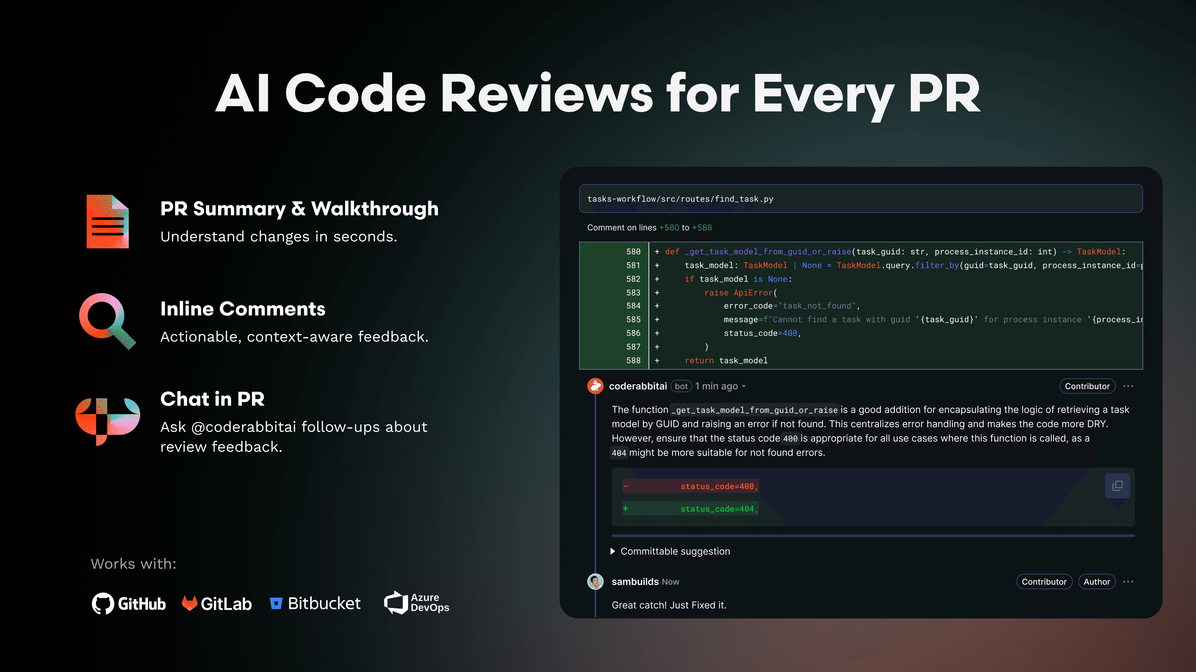 Open a test PR Push a branch and create a PR—CodeRabbit will post a summary and inline review.