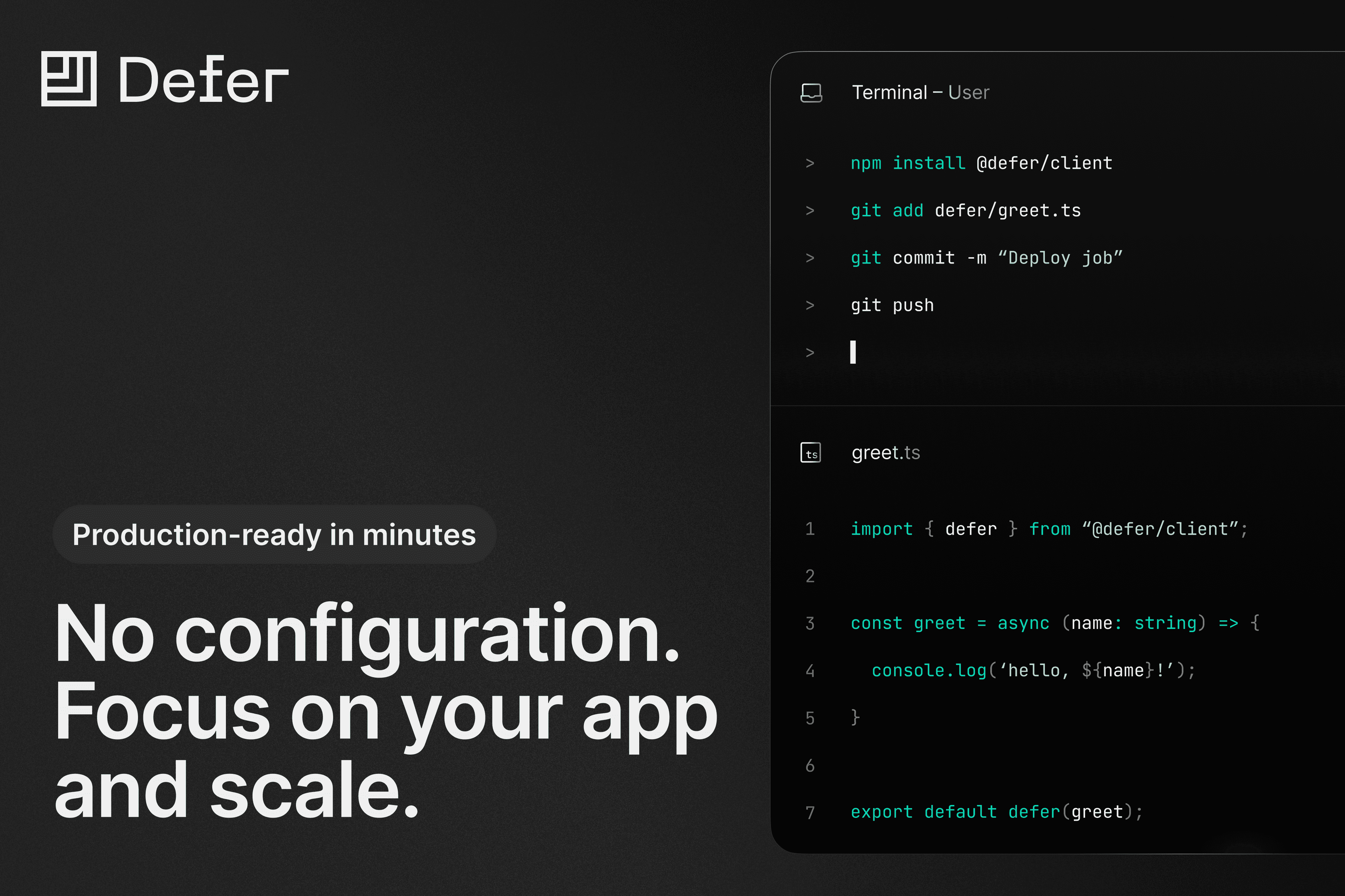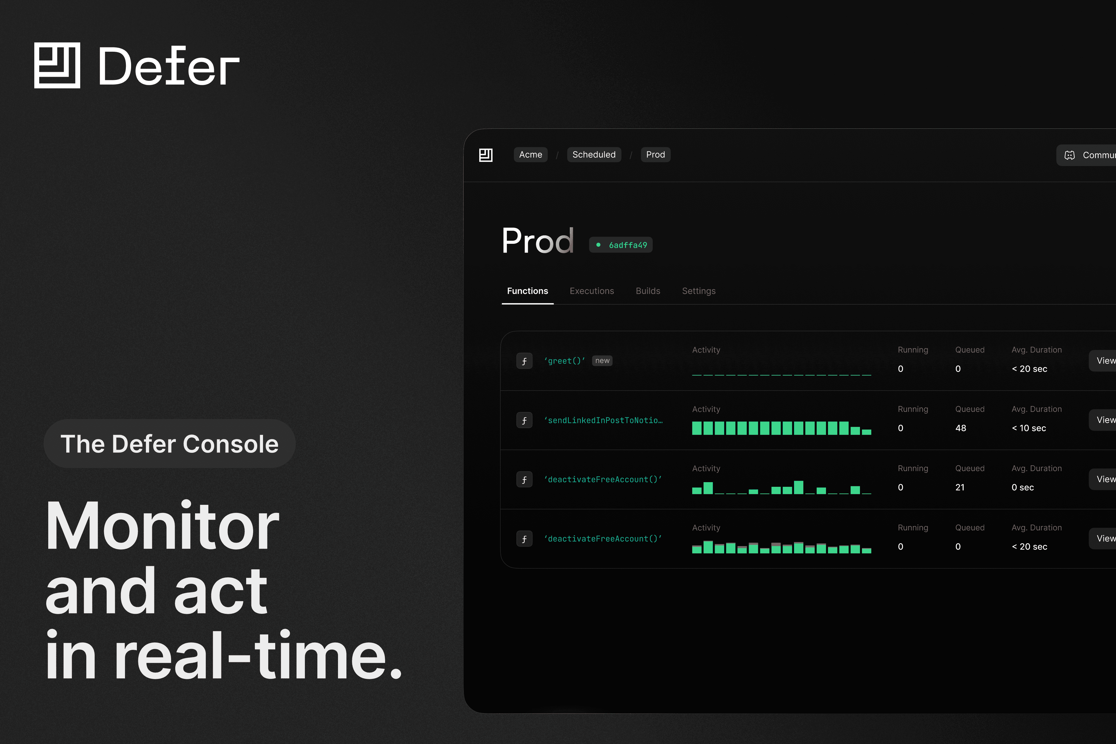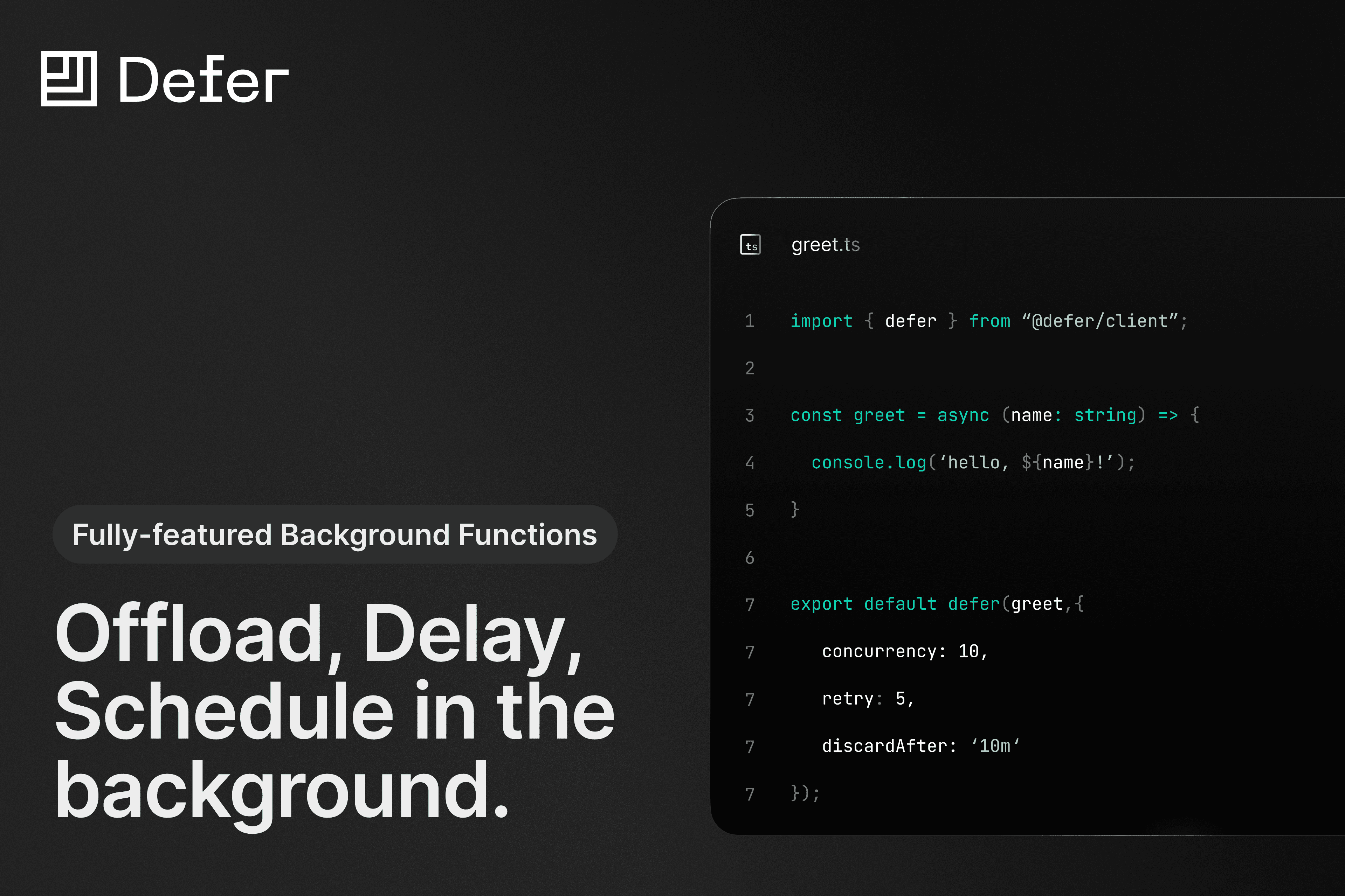 With Defer, keep your Serverless and Edge Functions fast by offloading long-running operations into Background Function, leverage the Bun Runtime for faster processing, and run Puppeteer scripts; all this without leaving your Next.js code and with the best Console available.