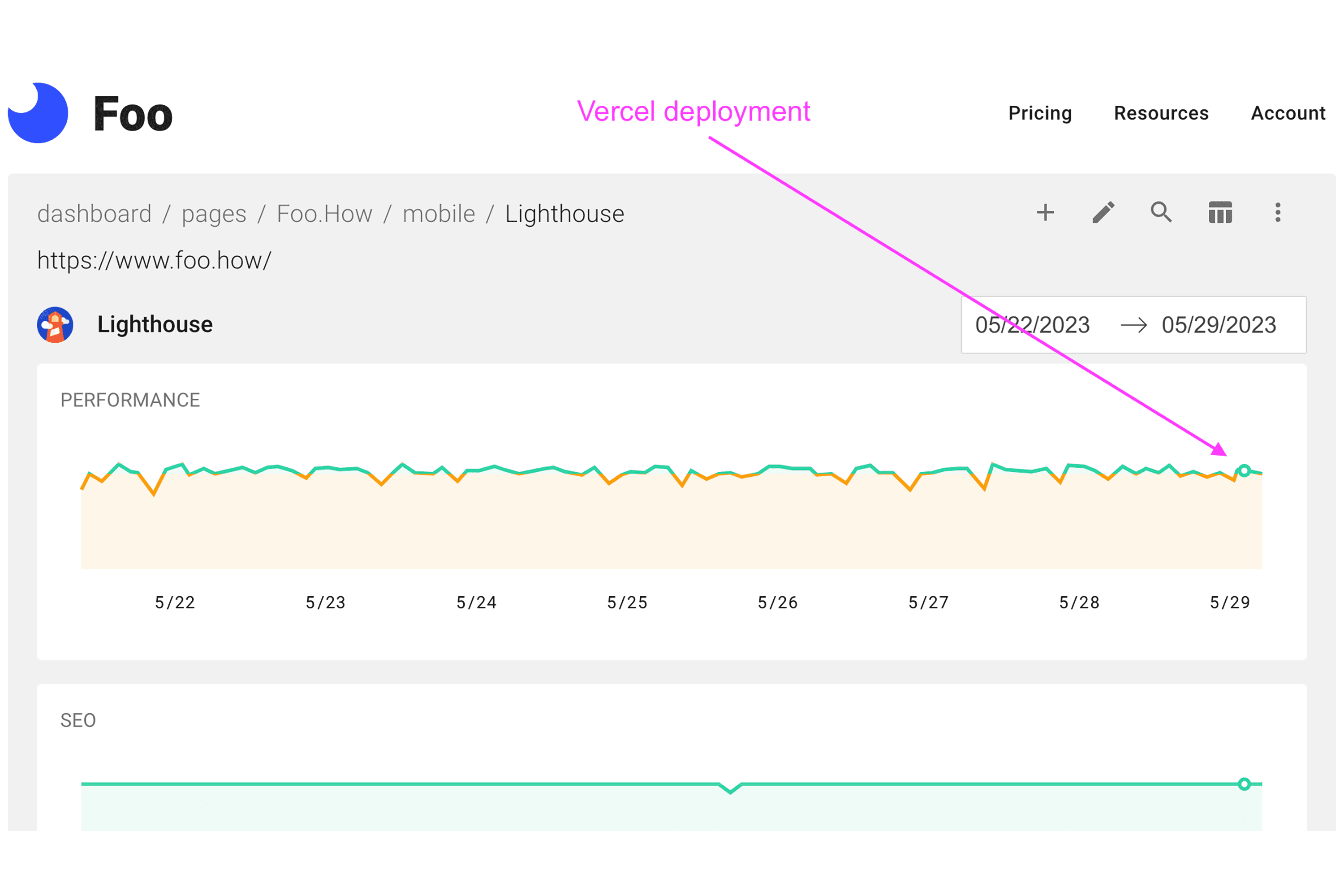 - Results of each Lighthouse audit are persisted to your account and surfaced in historical timelines of scores for each page. In the timeline chart each Vercel deployment will be displayed as a marker and annotation of the deployment. This way, if you have a premium plan in which Lighthouse runs occur throughout the day or if you've manually triggered any, the ones ran via Vercel can be easily identified by these markers (screenshot below).