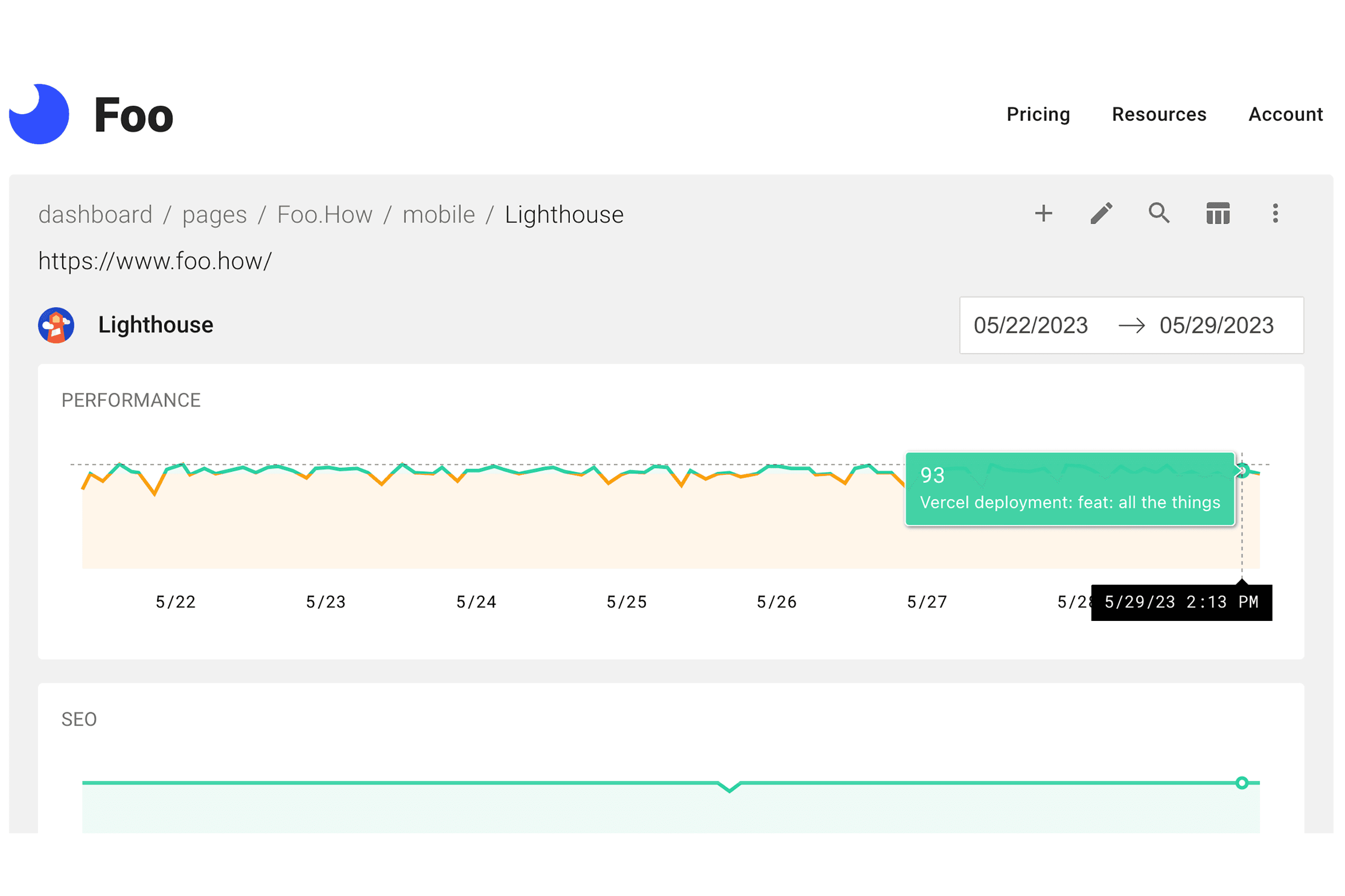 Monitor performance and page experience over time with Foo's Vercel integration. Every production deployment is tested via Lighthouse, surfacing a historical timeline of scores and insights. Synthetic (lab) data from Lighthouse is important in providing details that help identify specific issues and opportunities for improvement.