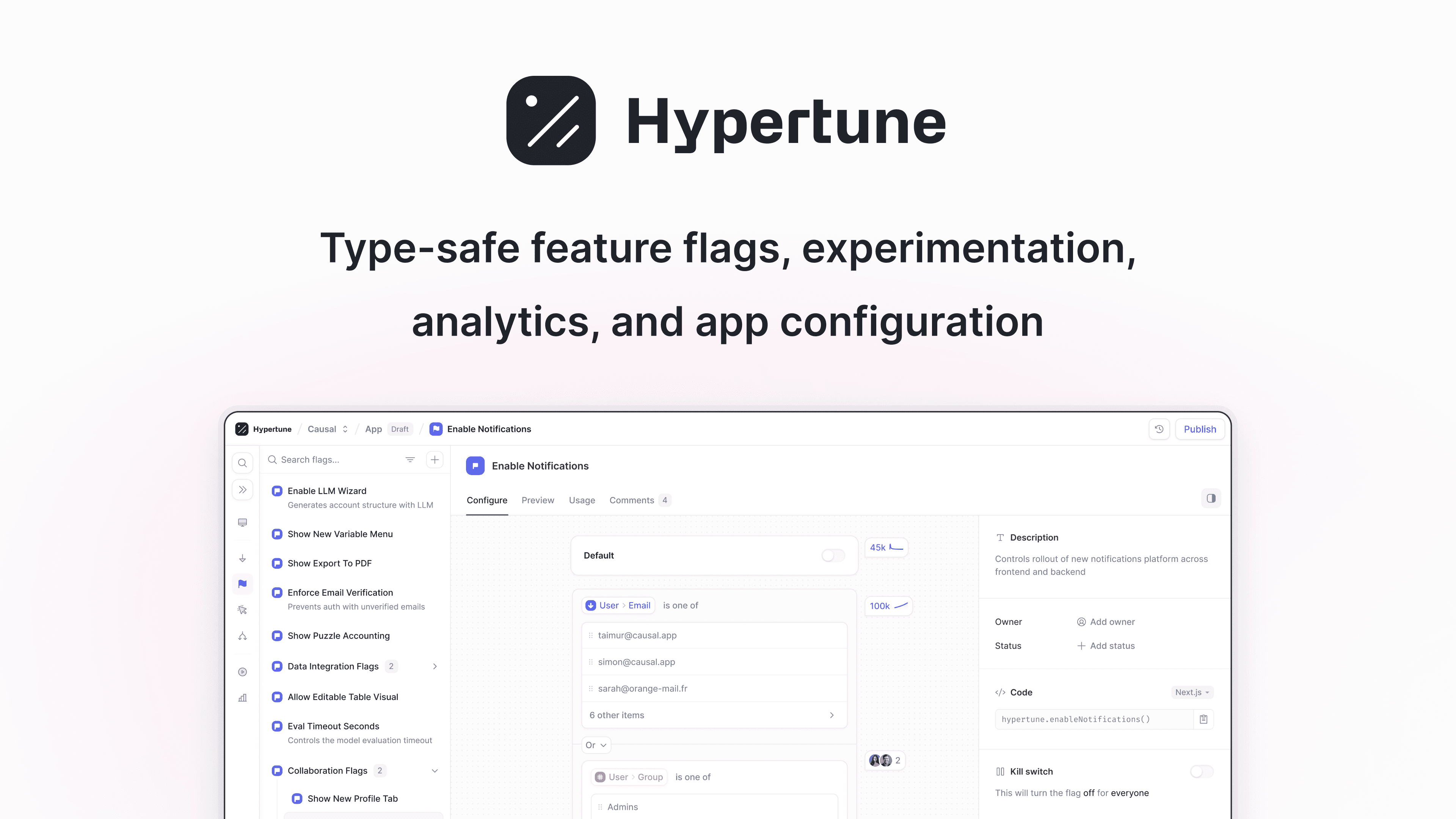 Hypertune is the most flexible platform for feature flags, experimentation, analytics, and app configuration. Built with full end-to-end type safety and Git-based version control. Optimized for TypeScript, React, Next.js, and Vercel.