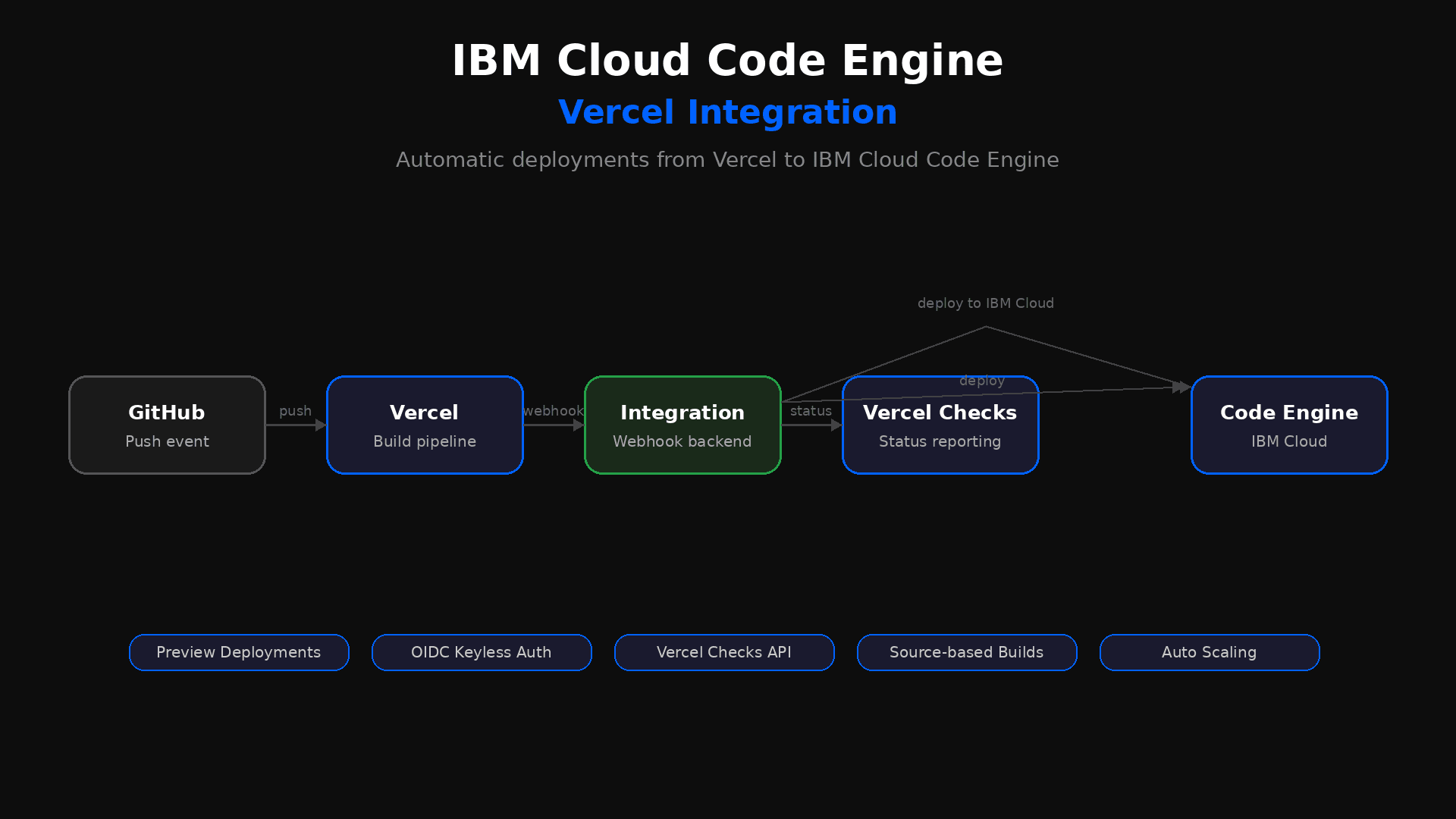 Automatically deploy your Vercel projects to IBM Cloud Code Engine with every push. Get preview deployments per branch, real-time status checks in the Vercel dashboard, and keyless OIDC authentication — no secrets required.