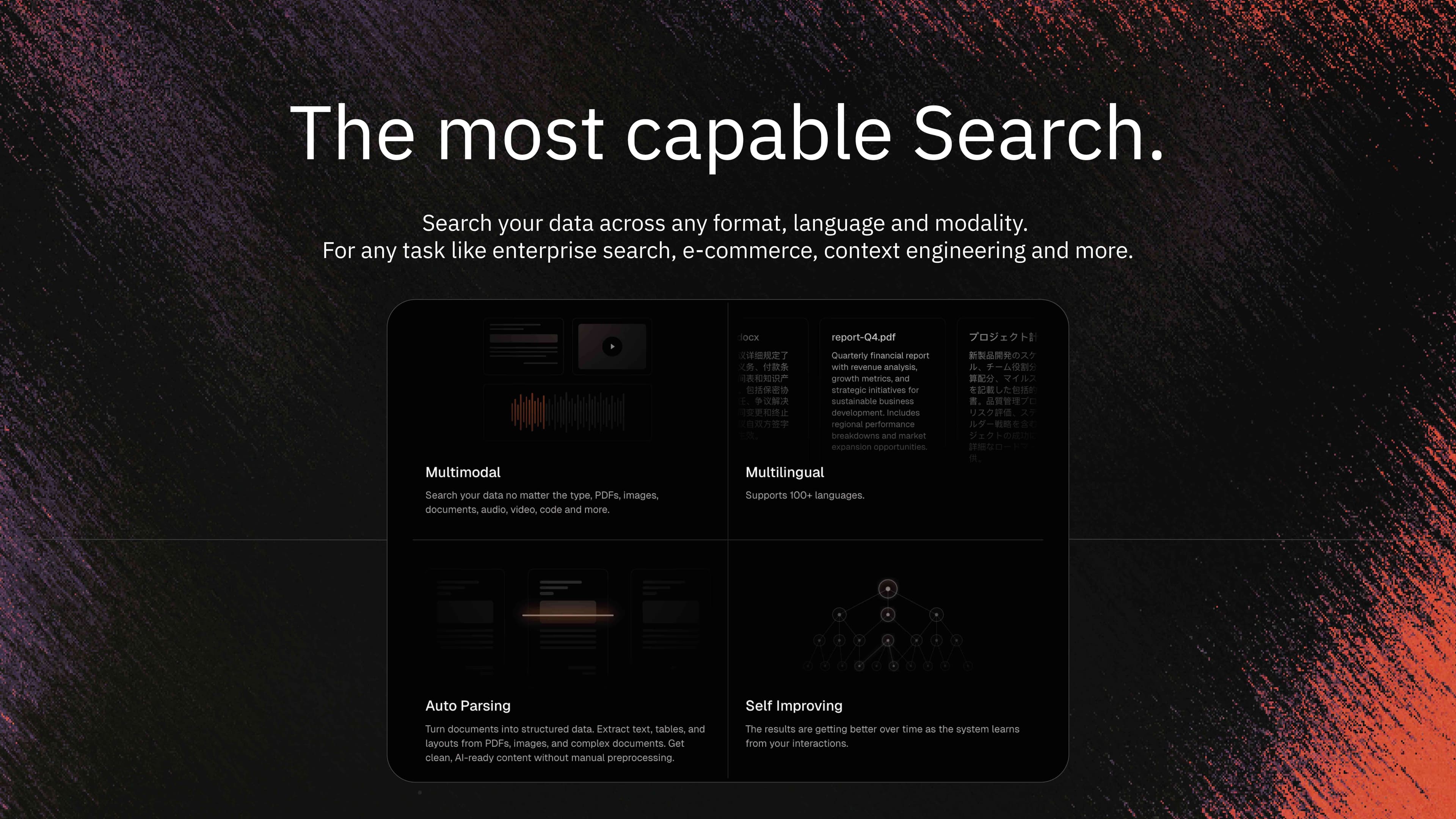 Mixedbread is the most comprehensive search api. It is multimodal (supporting audio, video, images, text, code), multilingual (over 100 languages) and easy to use.