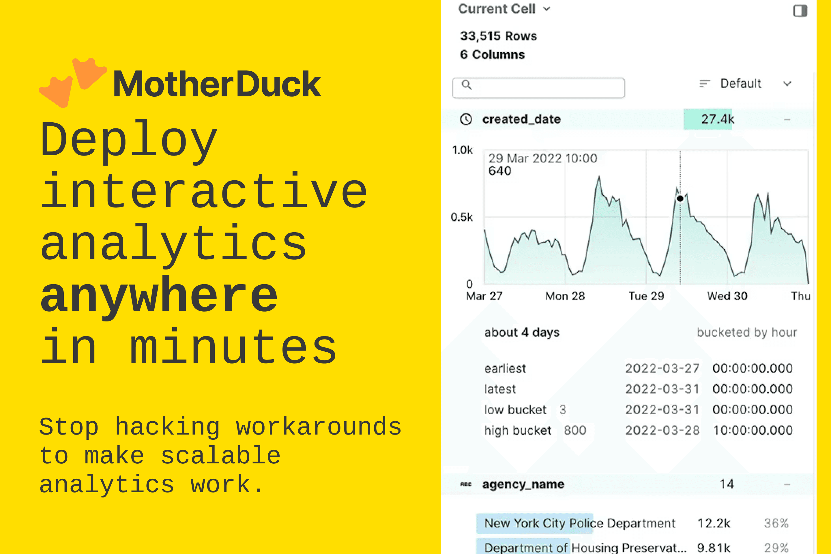 MotherDuck is the serverless backend for analytics. Start building with a 30-day free trial.