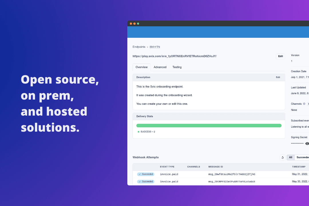 Svix is designed for developers. Our simple yet powerful webhook API provides you with everything you need to offer a world-class webhook experience.