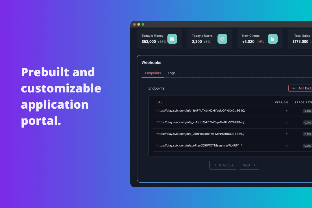 Your customers can register to consume your webhooks using Svix's Application Portal. Depending on your requirements, you can embed the Portal into your Vercel webapp, direct your users to its standalone page on svix.com, or even build your own using our API.