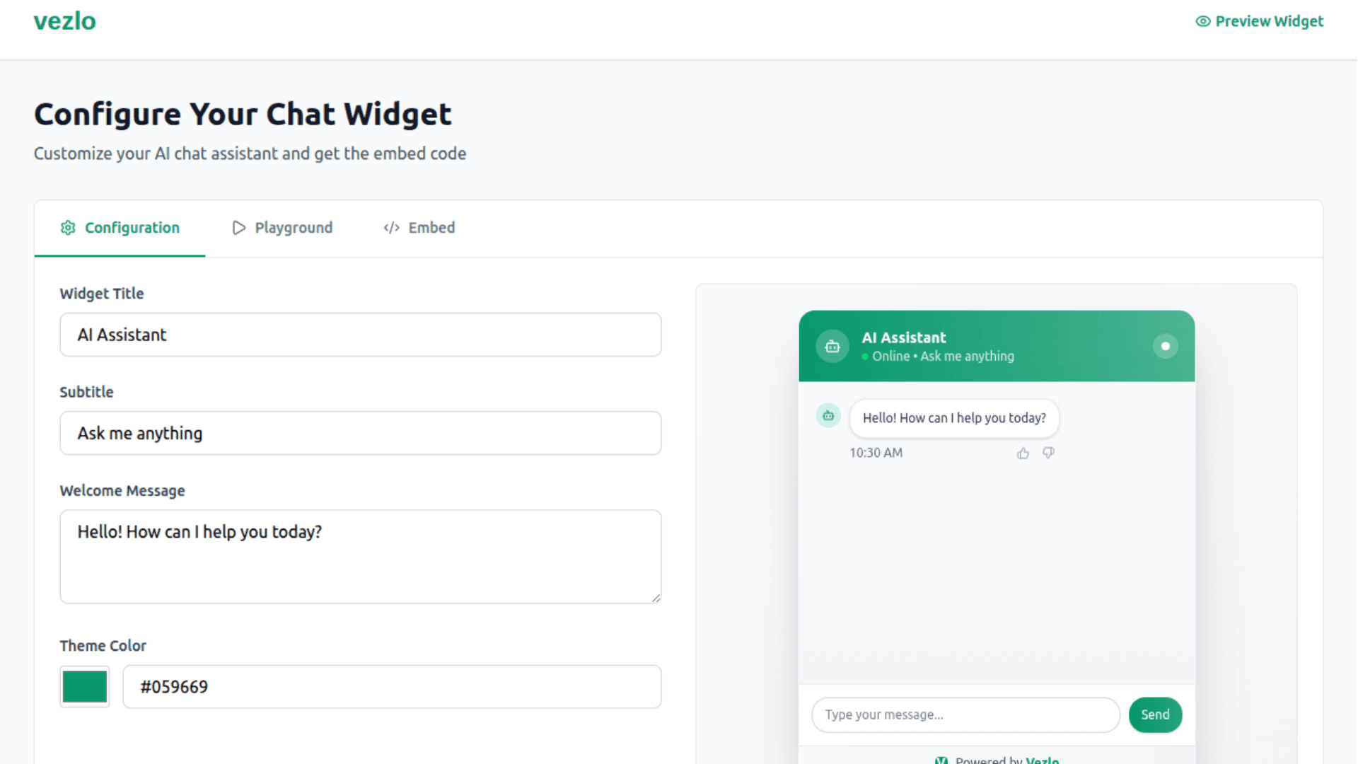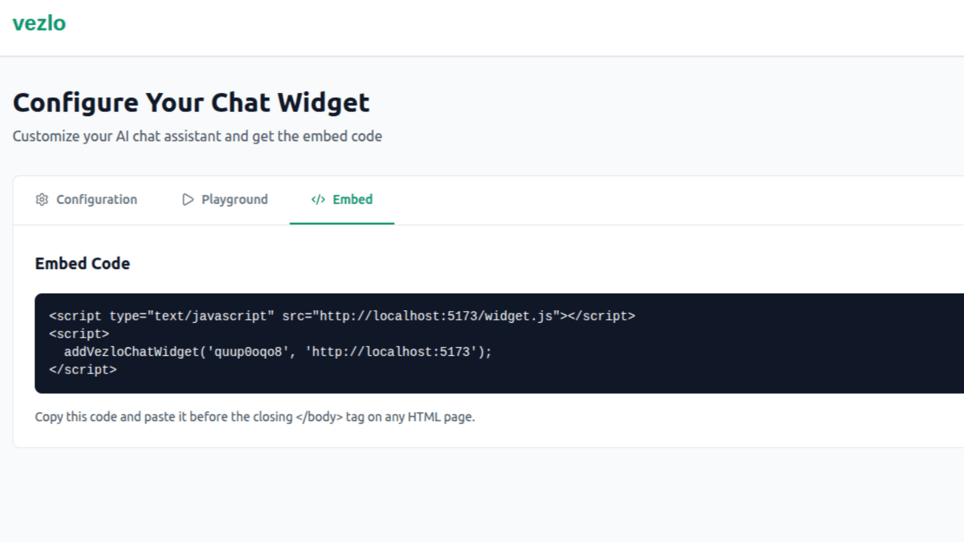 <script type="text/javascript" src="https://your-project.vercel.app/widget.js"></script><script> addVezloChatWidget('YOUR_ASSISTANT_ID', 'https://your-project.vercel.app');</script>For documentation and customization options, visit the Assistant Chat GitHub Repository.
