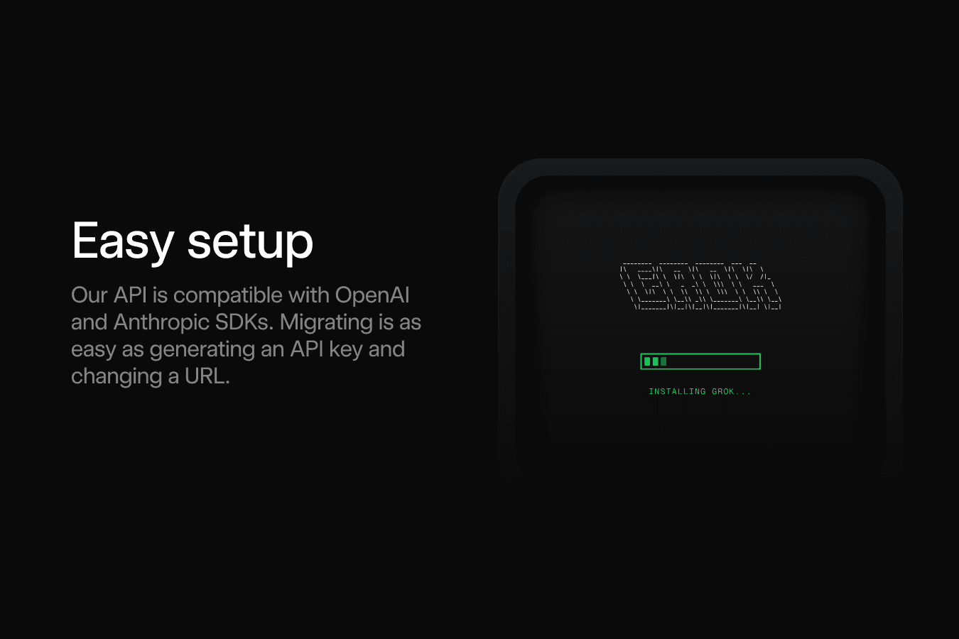 Clicking "Open in Grok" allows you to explore the available models in the xAI console. You can also experiment with them in the playground before integrating them into your application. Our API supports OpenAI, and Anthropic compatible endpoints, making it easy to get started without writing custom code.